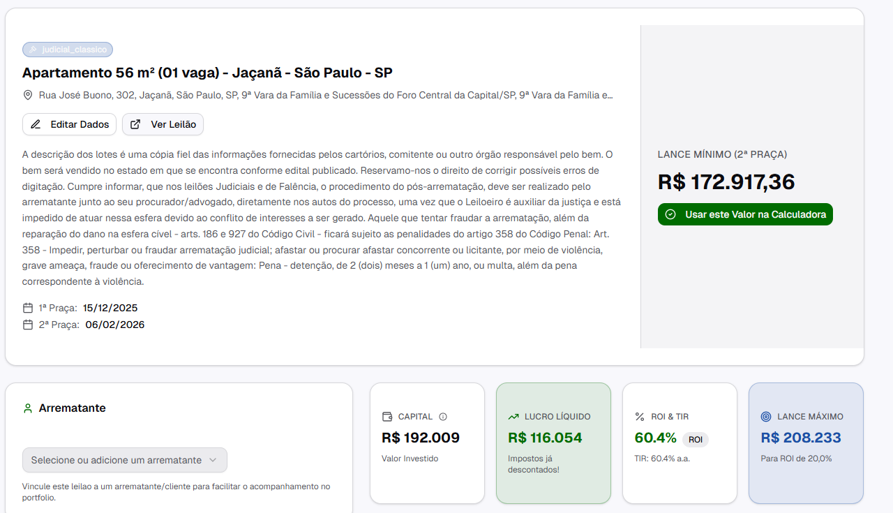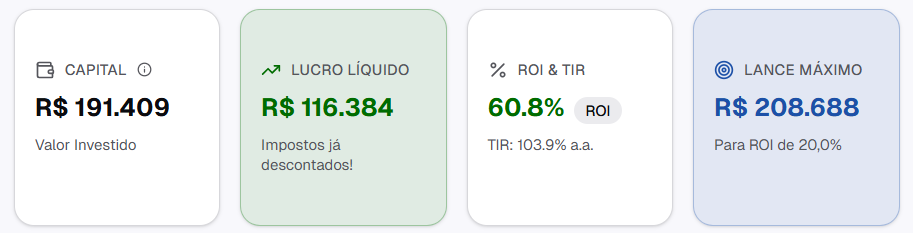 Calcule automaticamente ROI, TIR e o lance máximo que você pode dar para atingir sua meta de lucro. Compare com CDI e tenha certeza de que seu investimento vale a pena.